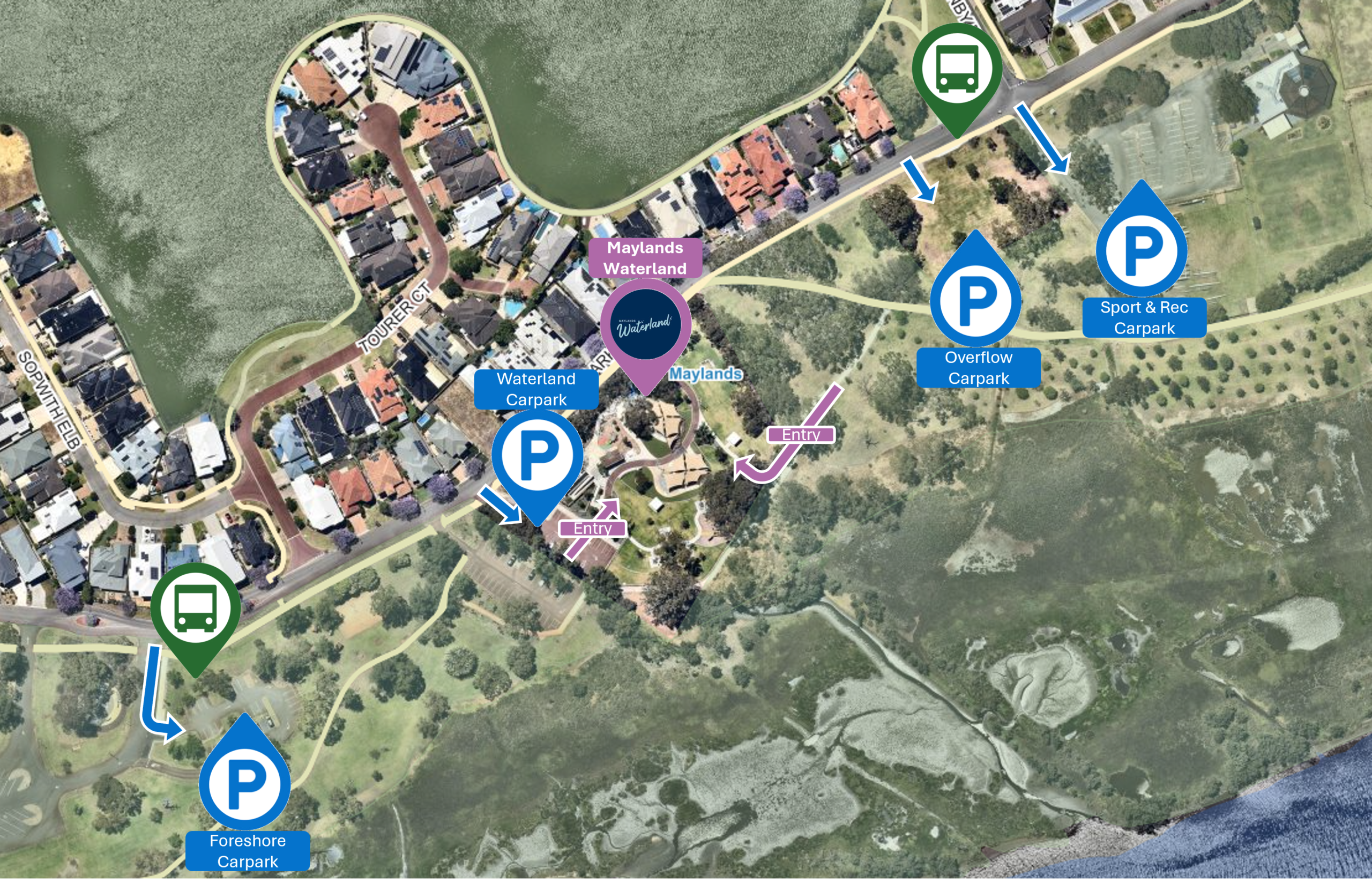 PATRONS PLEASE NOTE: Parking around Maylands Waterland is limited. While we are planning to increase availability in the future, please obey local parking signage to avoid incurring an infringement. Public transport to and from Waterland is available on Transperth Bus Route 42.